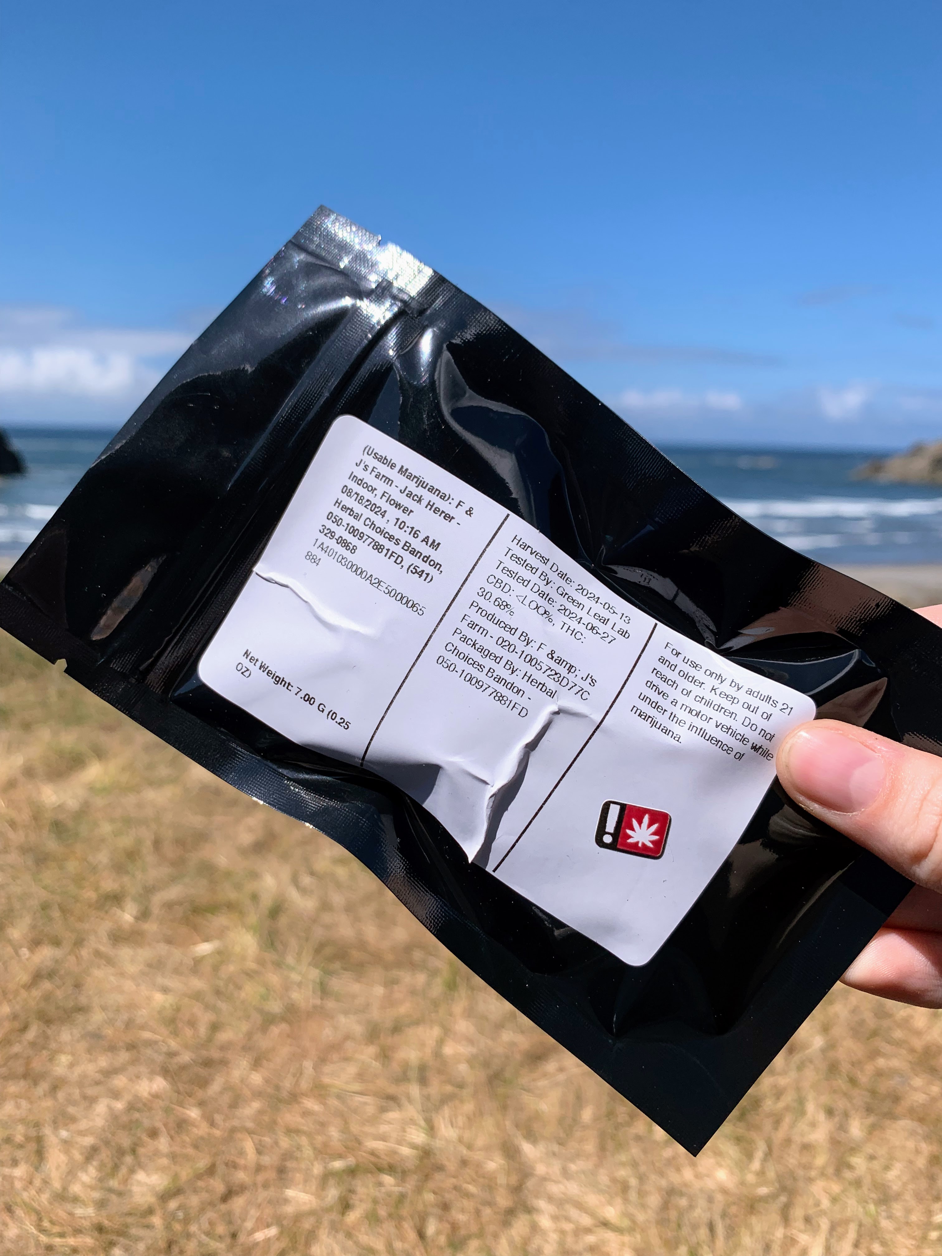 I visited Herbal Choices in Bandon, an Oregon dispensary with locations up and down the coast. Here I bought several items, among them a quarter of an ounce of Jack Herer flower for a mere $35. The flower was on special, but getting a cool Q at this price is unheard of.