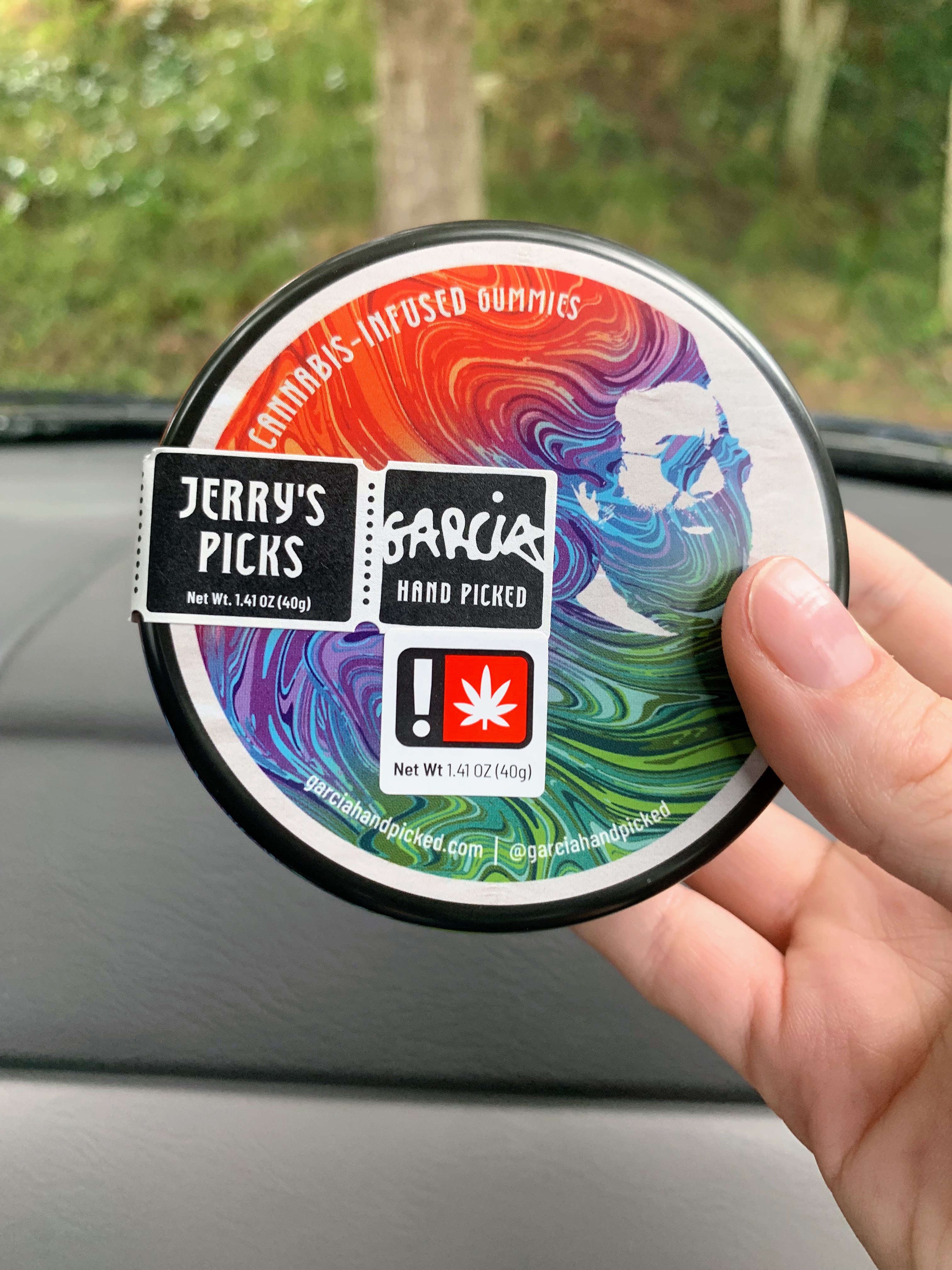 I didn’t even pick out these! There’s a long story here involving van repairs and a loaner car, but the short version is: I sent my husband into an Oregon dispensary with instructions to find affordable edibles and he returned with these: Jerry’s Picks.