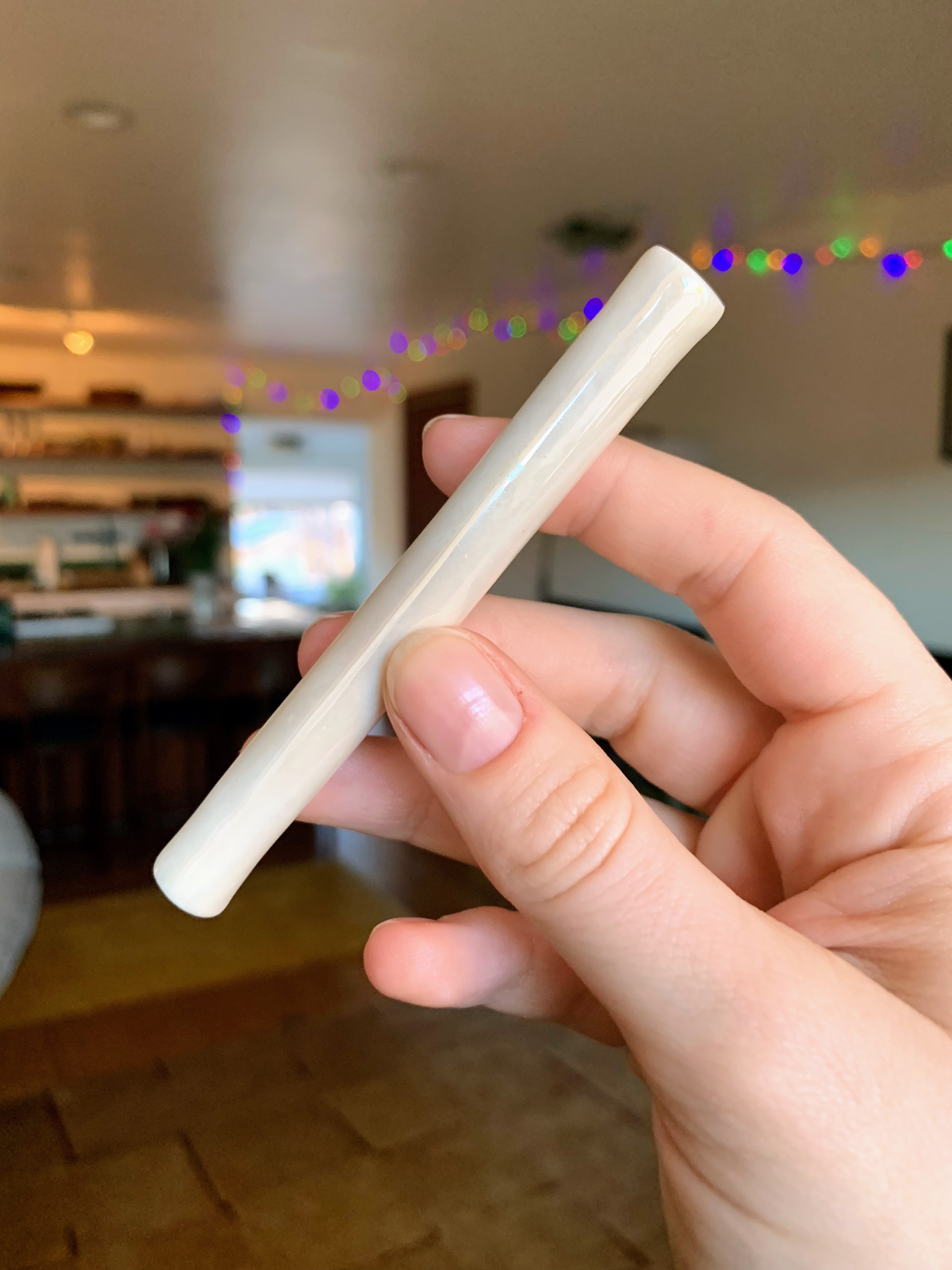 It’s made of durable stoneware coated in a food-safe glaze and shaped for easy packing and hitting. One could almost say it looks like a cigarette or joint, and you would be right. But the shape isn’t just for aesthetics – the long body of the pipe helps cool the smoke as it pulls through, giving you a smoother draw.